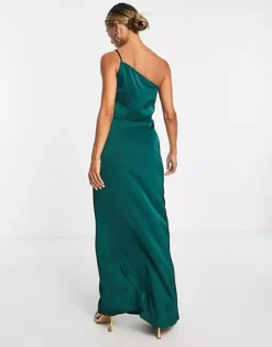 Vila Bridesmaid Satin Strappy One Shoulder Maxi Dress In Deep Green
