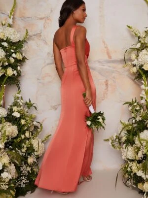 Sleek and sophisticated, this look is perfect for your bridesmaids. A silky satin fabric in a coral hue flatters any skin tone and any shape and size.