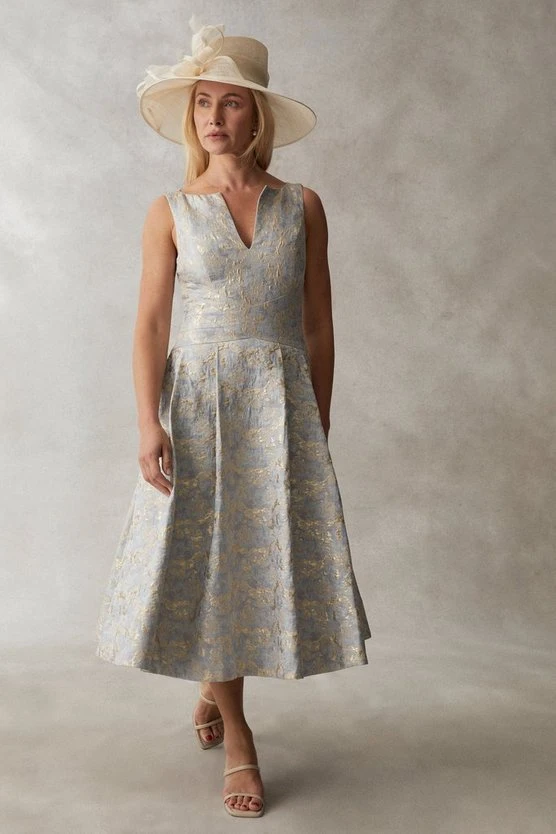 Stunning fblue and subtle gold Cross Front Jacquard Dress, perfect for a special wedding.