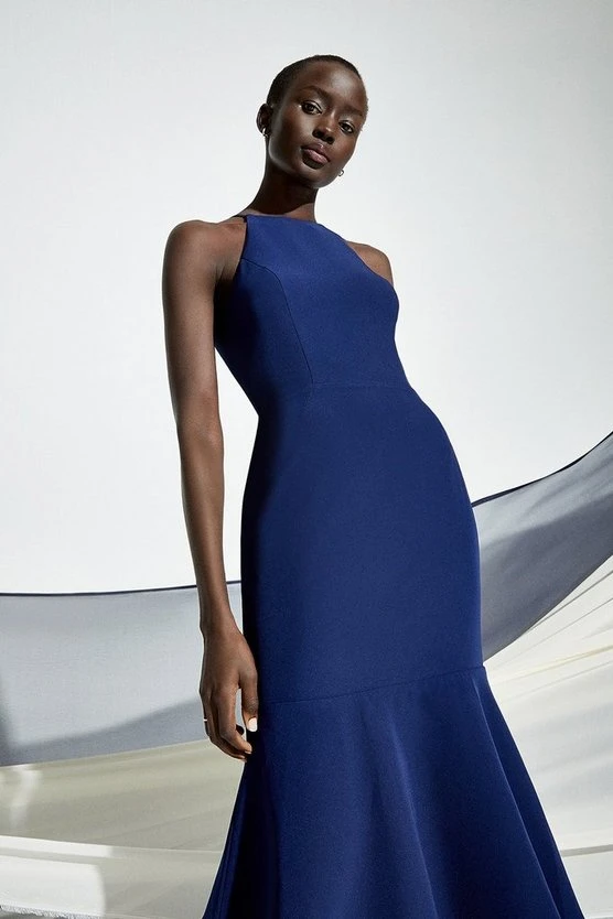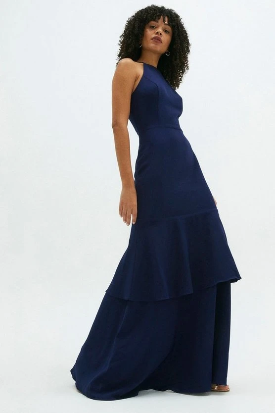 A stunning navy Halter Neck Tiered Hem Maxi Dress featuring a high halter neckline fitted bodice and floor sweeping skirt.