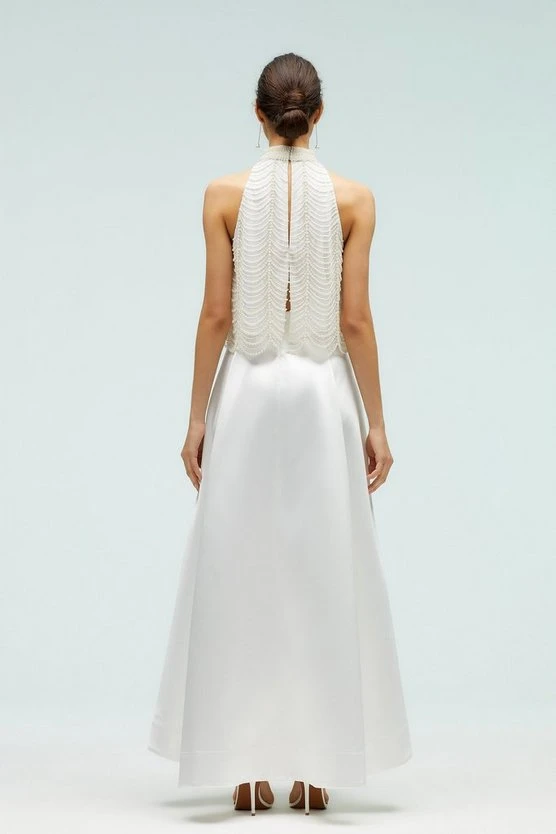 Stunning High Low Ivory Structured Twill Midi Skirt, perfect for a modern bride.