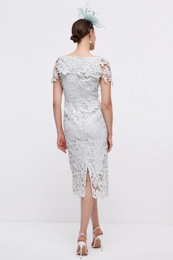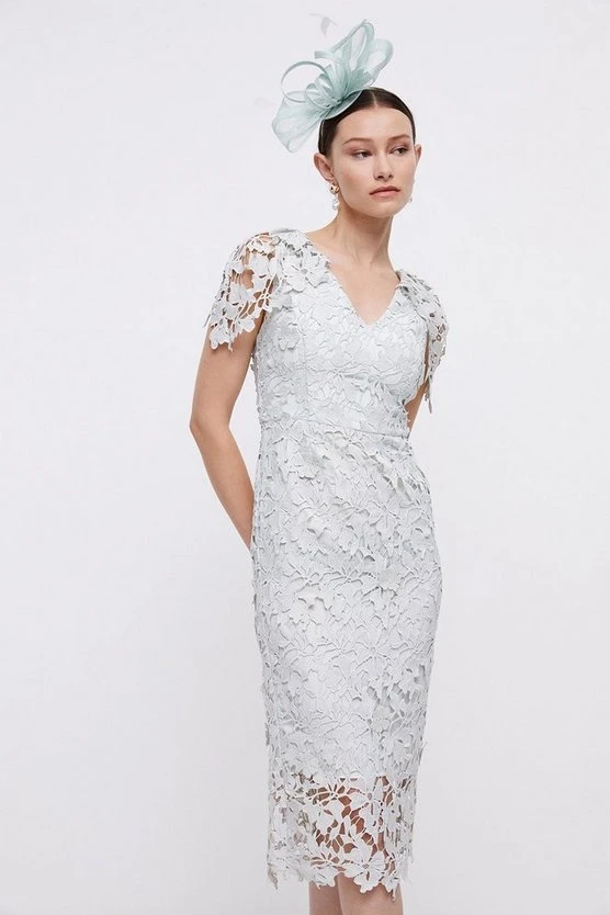 Beautiful sage Lace Pencil Dress With Cape Sleeve, perfect for a VIP guest.