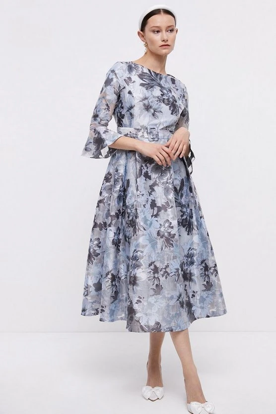 Beautiful grey Premium Belted Organza Jacquard Midi Dress, perfect for a VIP guest.