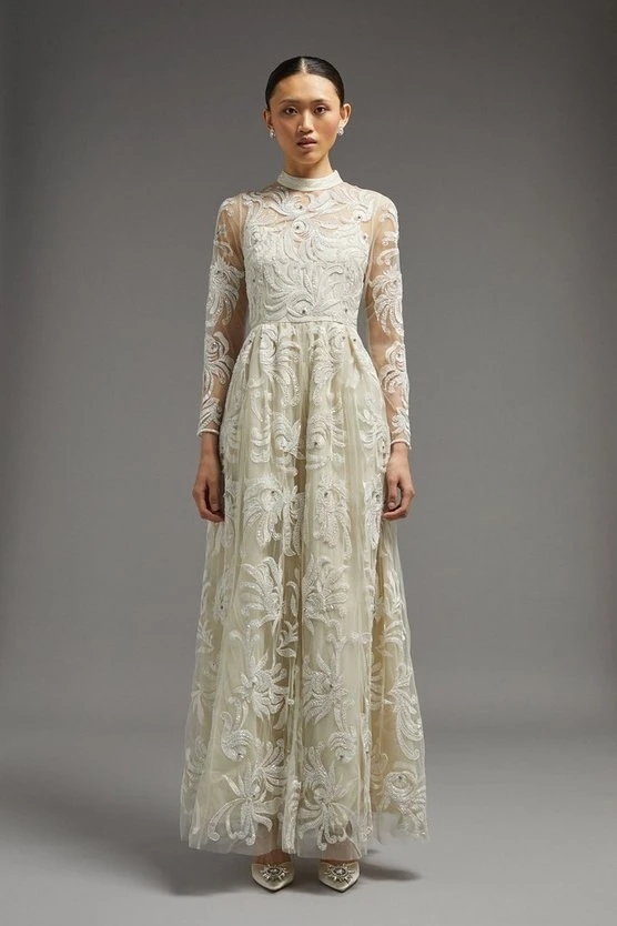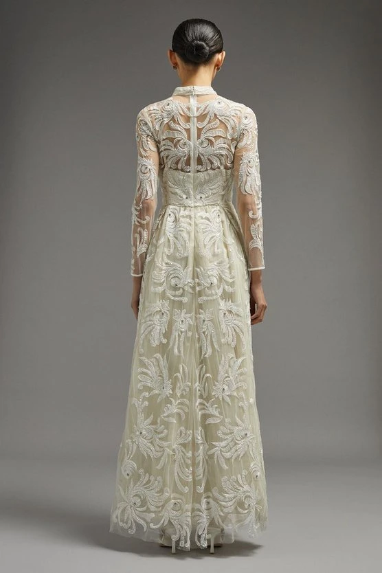 The picture of opulence, this heavily embellished maxi dress blooms with sequinned shapes intricately sewn onto a gauzy, semi-sheer overlay. Defined by its high neckline, long sleeves and flowing maxi skirt, this whimsical design epitomises old-school glamour.