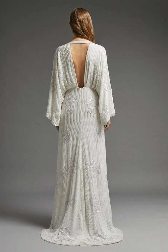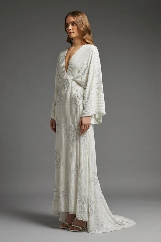 Create a stunning bridal look with this elegant ivory Premium Embellished Flare Sleeve Maxi Dress, perfect for a modern bride.