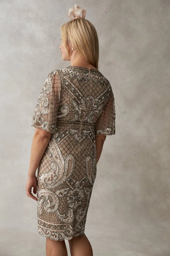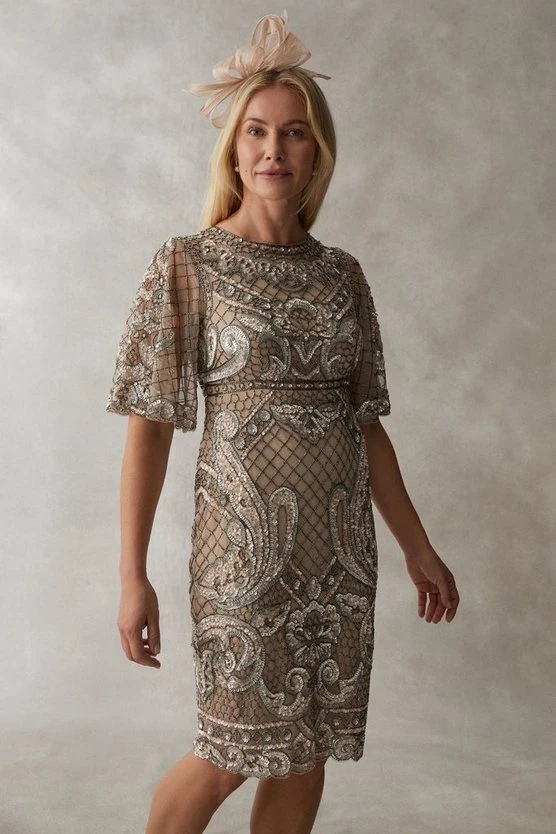 Stunning champagne Premium Hand Embellished Pencil Dress, perfect for a special wedding.