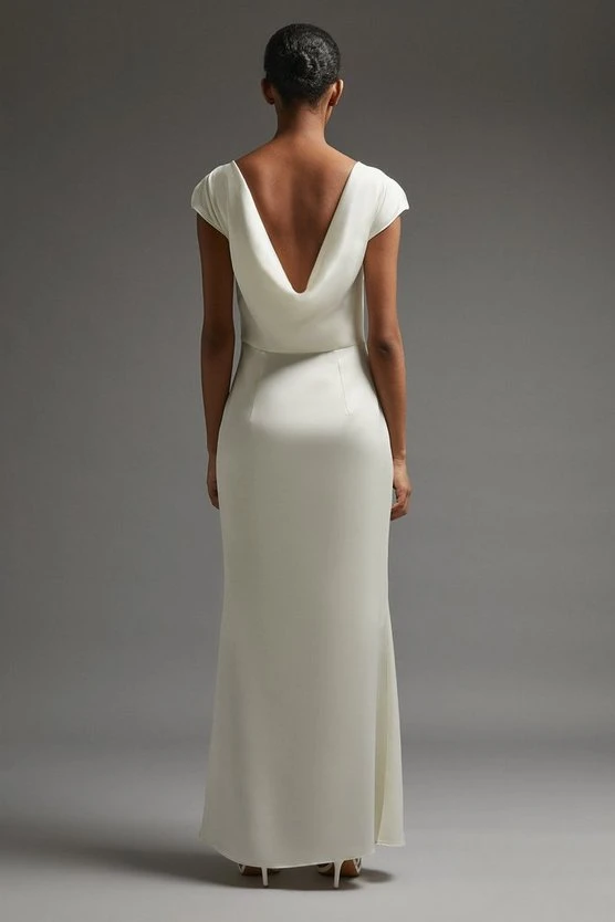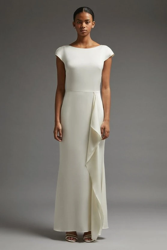 Punctuate your big day in truly special style with the romantic ruffles and flattering flow of this luxurious wedding dress. Sumptuously silky, it shows off a draped cowl back and split cap sleeves.