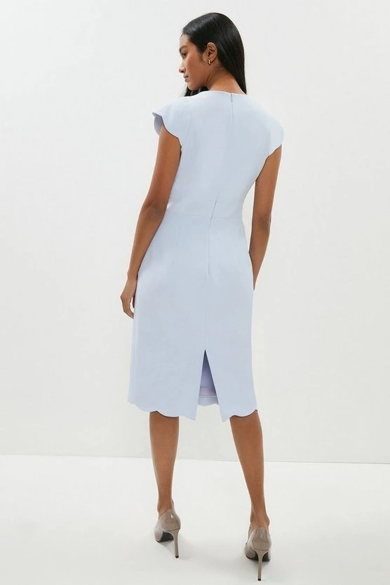 An elegant scallop hem pencil dress, ideal for a wedding guest. Main: 89% Polyester, 11% Elastane. Lining: 100% Polyester. Dry Clean Only.