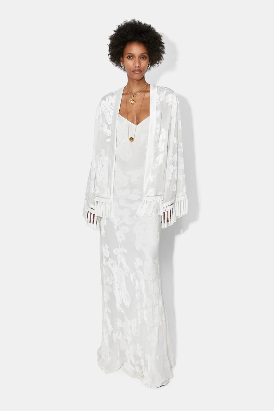 This effortless kimono captures bohemian flair and luxe nonchalance in equal measure. Crafted from pearly white silk velvet devoré, it features a trailing foliage motif bordered by a satin band at the front and finished with rich tassels. A luxurious cover-up that can be dressed up or down, it is embellished with joyful fringing and tactile patterns, encapsulating bohemian escapism and storied travels.