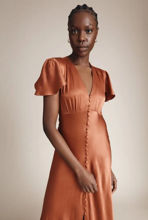 Vintage-like in silhouette and style, the Delphine in brick is a timeless design. Cut into a gentle V-neck, its button-through front gives way to a split to create movement whilst walking and to showcase your choice of shoes and finishes with a train hem. Gathered detail around the shoulders and under the bust adds to its feminine appeal. Made from heavy satin fabric obtained from sustainable sources, it is cut on the bias for a flattering fit. Delphine is an occasion-wear must-have and would make a perfect bridesmaid dress.