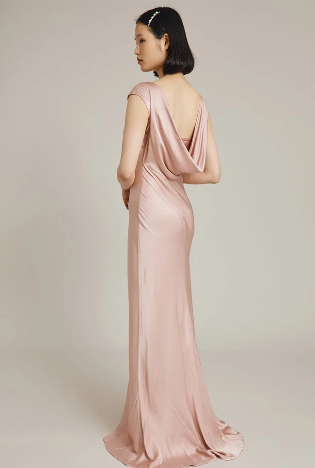 The Ghost Salma dress in pink features a boat neckline, capped sleeves, with a glamorous vintage inspired dipped cowl neck at the back. This dress has flattering cut and maxi length with smooth heavy good quality satin fabric. Stunning dress perfect for bridesmaids or the bride.