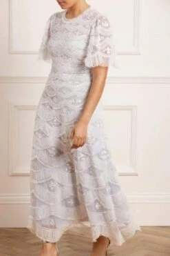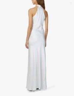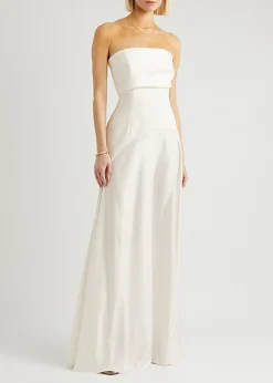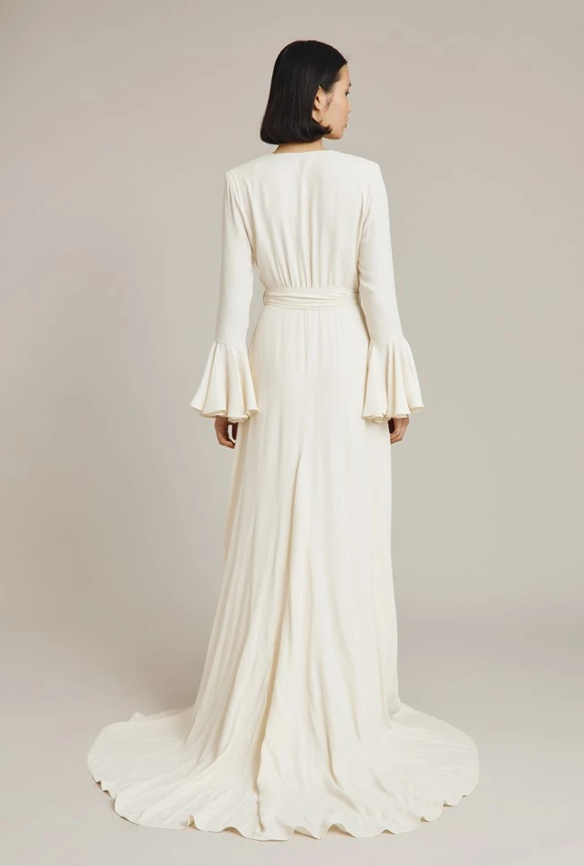 Fusing ‘70s romance with statement details, the Viola dress is a striking design. Universally flattering, its voluminous bell sleeves and fabric covered buttons create drama while the gathered detail around the shoulders and matching waist belt provide soft feminine touches. Beautifully flowing, it includes a hook fastening for the train to allow for easy movement. Made from satin-back crepe and fully lined.