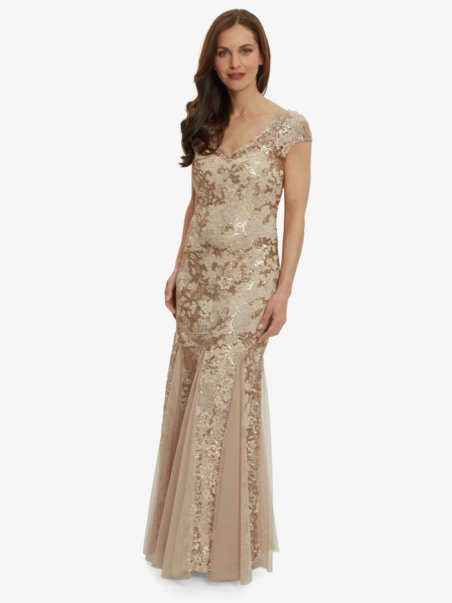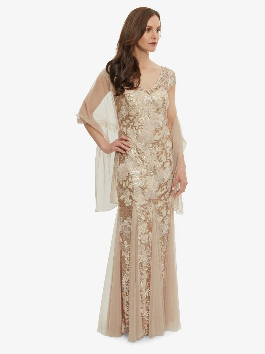 This regal embroidered mermaid dress is luxuriously detailed with godet inserts at the hem. A figure-flattering illusion v-neckline and cap sleeves make this dress the epitome of elegance and the floral embroidery detail adds the perfect touch of femininity. Complete with a matching shawl.