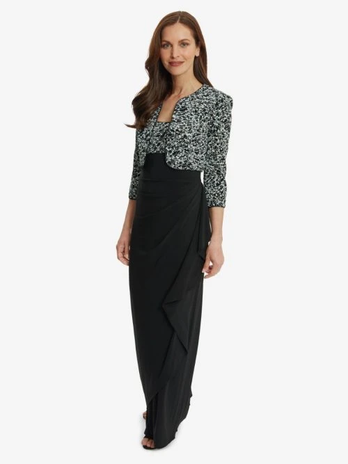 Long Empire Waist Slinky Bolero Jacket Dress with Side Ruched Skirt.
