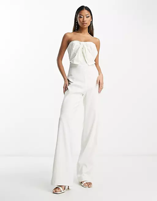 Karen Millen Viscose Satin Crepe Feather Bandeau Jumpsuit, Ivory
