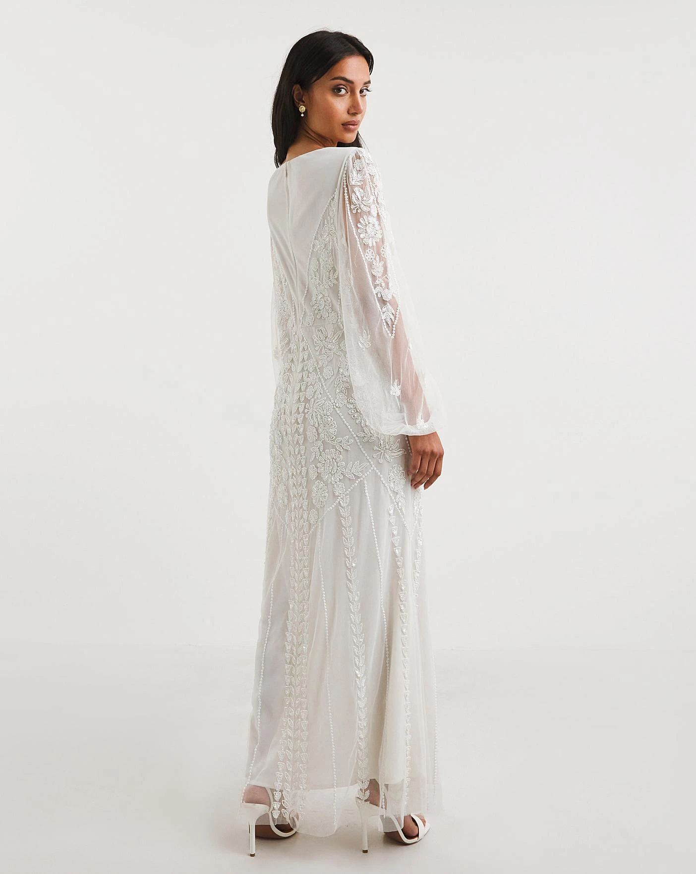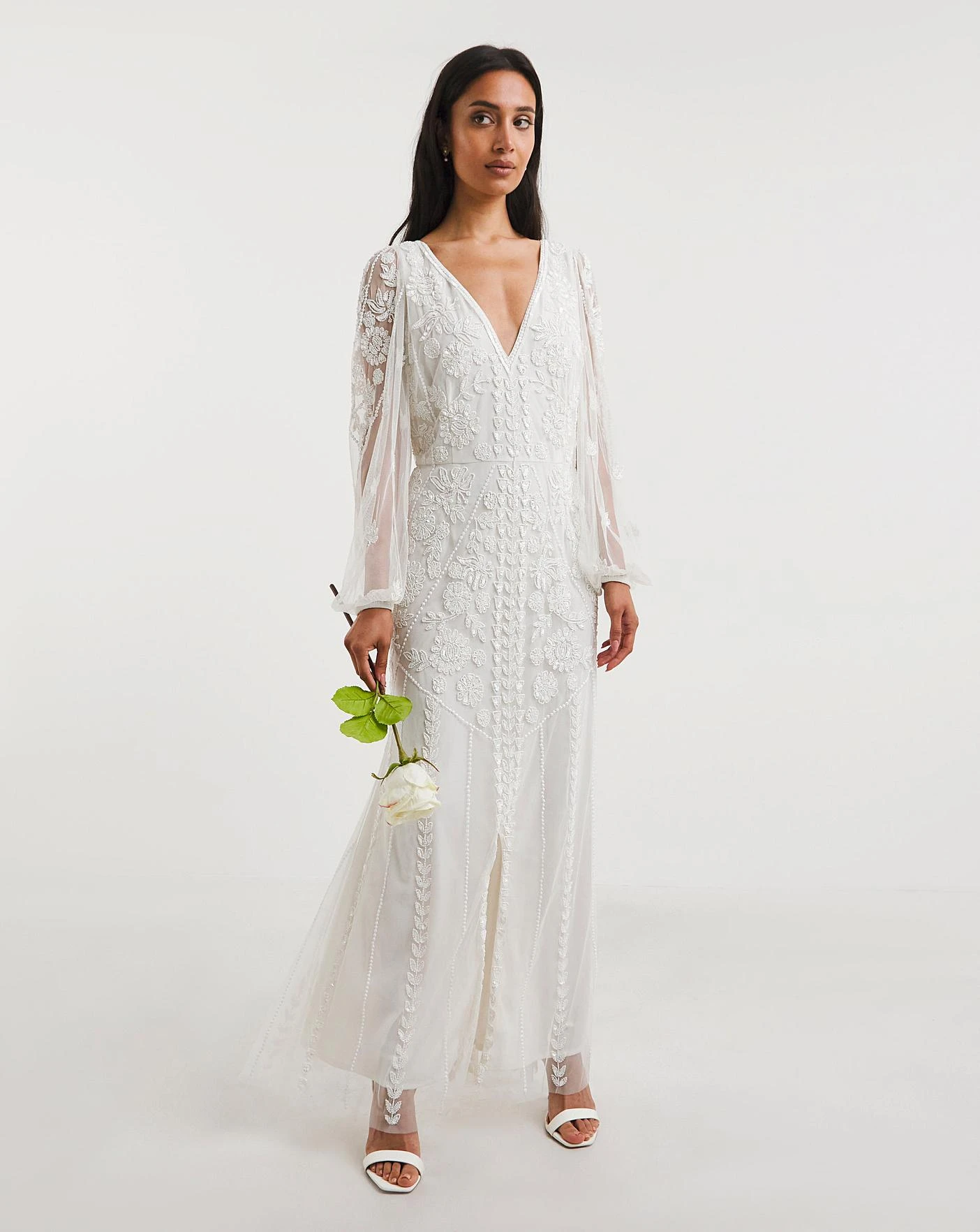 Our Joanna Hope Beaded Bridal Dress is a pretty, intricately decorated style with trailing beading throughout that is guaranteed to take your guests breath away. The deep v-neckline is framed by a mesh beaded overlay with flowing sheer balloon sleeves. A subtle leg split adds a feminine touch, allowing you to dance through the night on your big day.