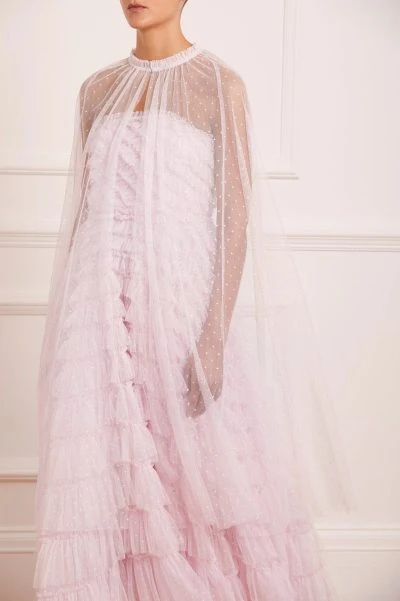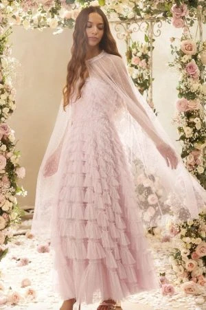 NEW SEASON |NEEDLE & THREAD EXCLUSIVE. The Elizabeth Rose Midaxi Cape in Wisteria. This cape is delicately textured with ‘x’ kisses tulle and signature Needle & Thread frills across the neckline. Beautifully designed to style layer over our Elizabeth Rose Corset Ankle Gown.