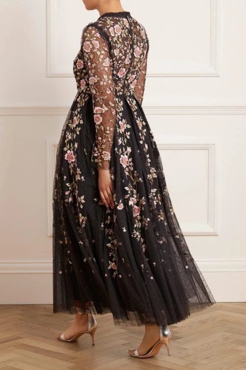 NEW SEASON. The Lillian Rose Ankle Gown in black. This beautiful dress is inspired by floral artwork taken from an intricate Victorian fan. Crafted elaborately with layers of tulle and net creating a romantic silhouette with sheer elegant sleeves. Decorated with embroidered trailing rose motifs engineered throughout in muted green and rich reds. Make space in your wardrobe for the Lillian.