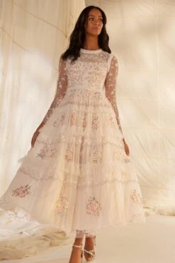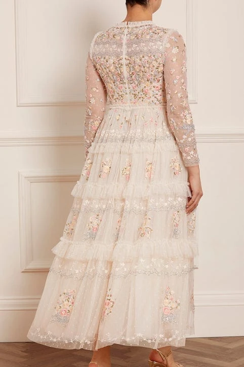 NEW SEASON. The Primrose Bouquet Long Sleeve Ankle Gown in Cream. This gown is intricately designed with embroidery and beading work. Decorated with floral border motifs, inspired by beautiful bouquets. Designed with elaborate embellishment using silver cut beads and components to create highlights of shimmer. The silhouette of the dress has perfectly placed tulle frills and layers of net to create romantic volume. Make a statement in the Primrose Bouquet.