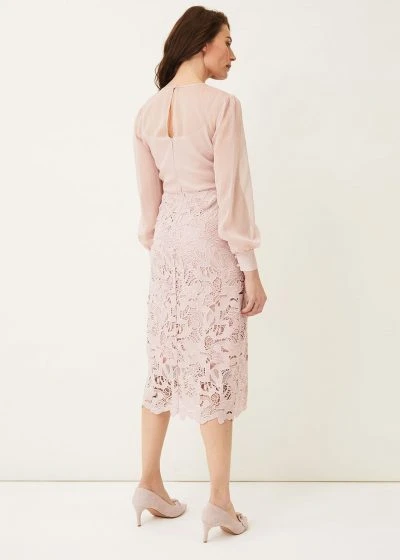 Our Aldora Dress is all about the details. Designed with a semi-sheer pintucked bodice and a contrasting floral lace midi skirt. This style is framed by semi sheer blouson sleeves. Perfect for future spring/summer RSVPs.