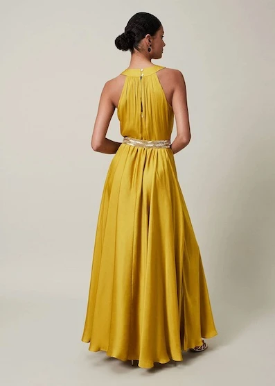 Part of Collection 8, our premium range of evening occasion styles. This is a stunning style that’s made to wow. Designed in a beautiful chartreuse shade, our halterneck dress features pleated detailing, a silver sequin belt to cinch in the waist and a falls to a flowing silhouette. This is the style to wear to your next special event.