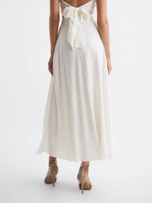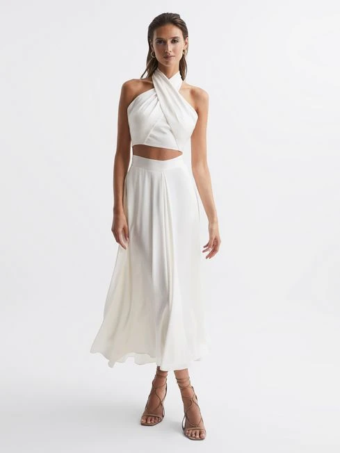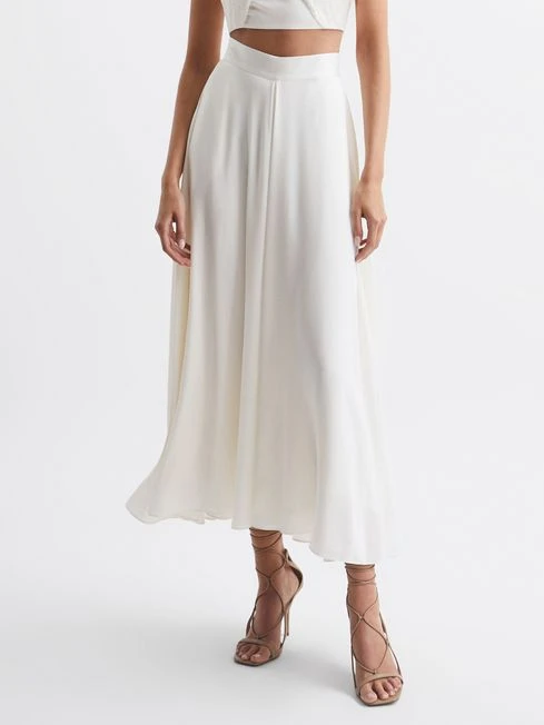 The ivory Ruby skirt sits high-rise, hugging the waist and skimming the hips, then falls gracefully to a maxi length. The flouncy fabrication showcases soft pleats, which lend a feminine note. Style with heels and the matching ruby halter top for an elegant occasionwear edit.