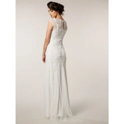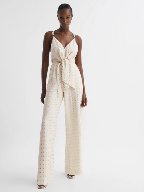 The Scarlet jumpsuit in ivory adds a decorative edge to a signature silhouette. Itβs cut with a deep v-neckline and fitted with adjustable shoulder straps. A tie element to the waist accentuates the frame and metallic detailing is featured throughout for a dazzling look. Get occasion-ready by adding wedge sandals and coordinating accessories.