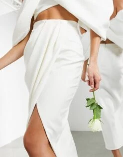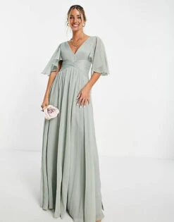 ASOS DESIGN Bridesmaid Flutter Sleeve Maxi Dress Satin Wrap Skirt, Olive Green