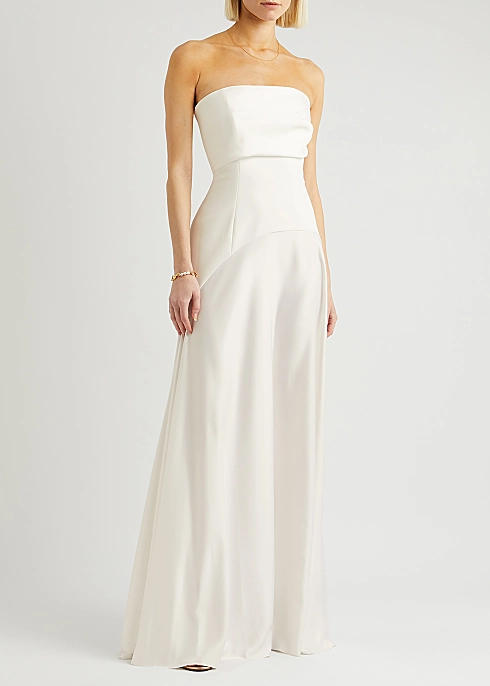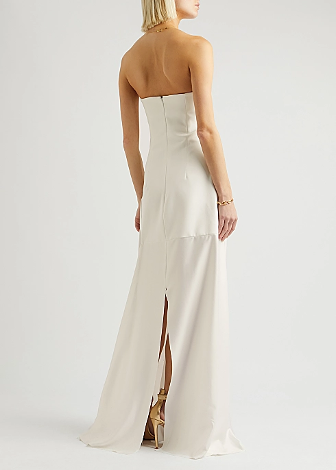 When it’s time raise a glass of Champagne, we’ll be toasting to this stunning ivory maxi dress. This elegant strapless style has a show-stopping finish.