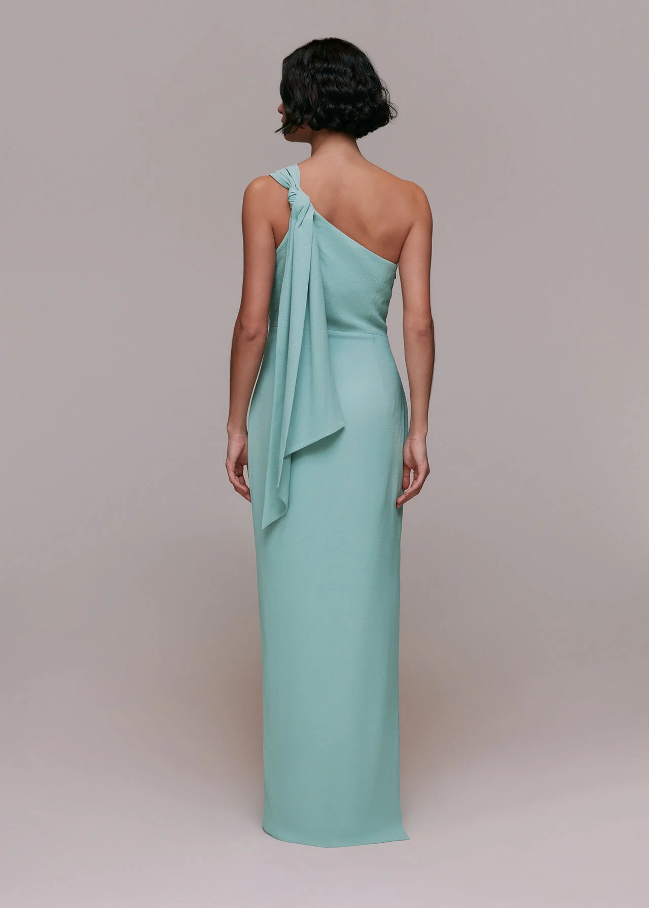 Designed with one shoulder, this modern bridesmaid dress features an elegant cascading back and the waist is slightly fitted, for added definition. The sage green shade feels timeless, just add simple strapped sandals and a sleek clutch bag.